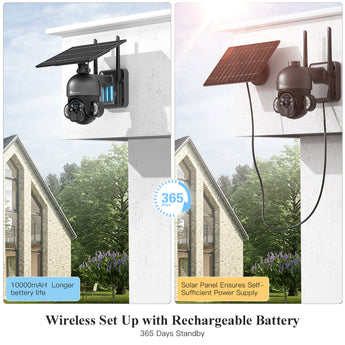 - 【360° Copertura, Installation bidirectionnelle】Grazie alla rotazione orizzontale a 360° e inclinación de 95º , la telecamera solare garantisce una ripresa panoramica di tutto ciò che ti circonda; Due metodi di installazione: Il primo è l'installazione all-in-one, semplice e conveniente. Il secondo è installare separatamente il pannello solare e la telecamera, che può essere realizzata utilizzando speciali staffe (non incluse) e Metti il pannello solare in un luogo soleggiato.