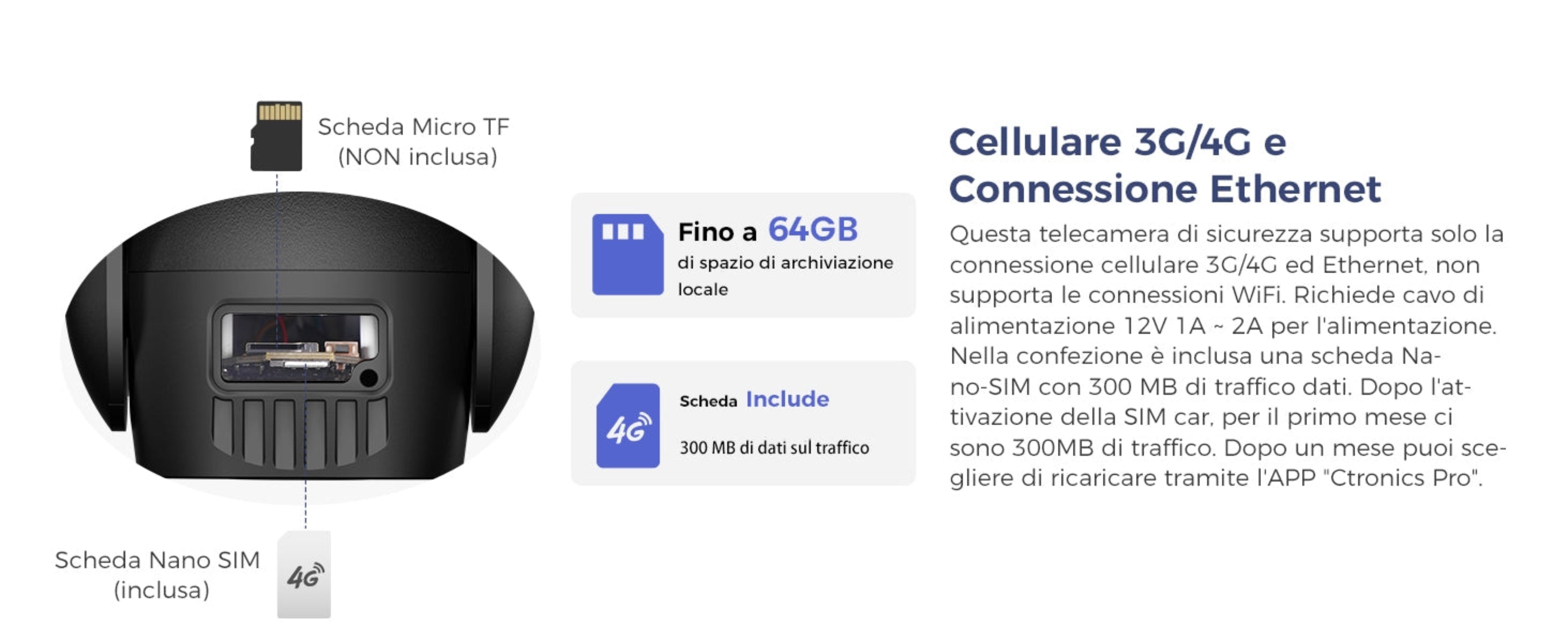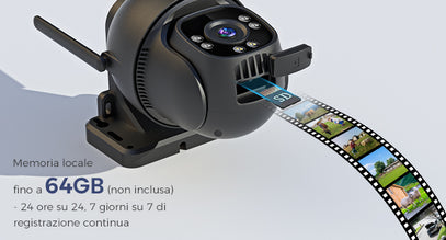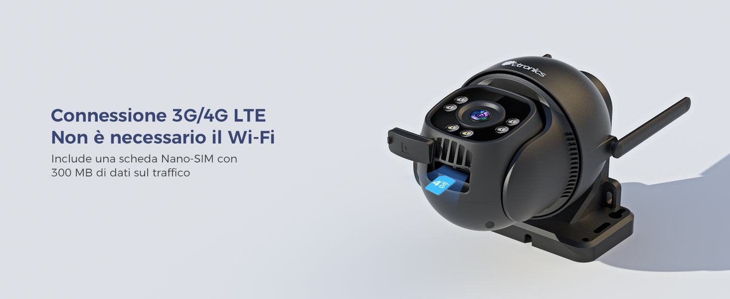 Questa telecamera esterno supporta connessioni cellulari 3G/4G o via cavo RJ45; non è compatibile con il WiFi a 2,4/5ghz. Dotata di una scheda Nano SIM (preinstallata) con 300 MB di dati.
