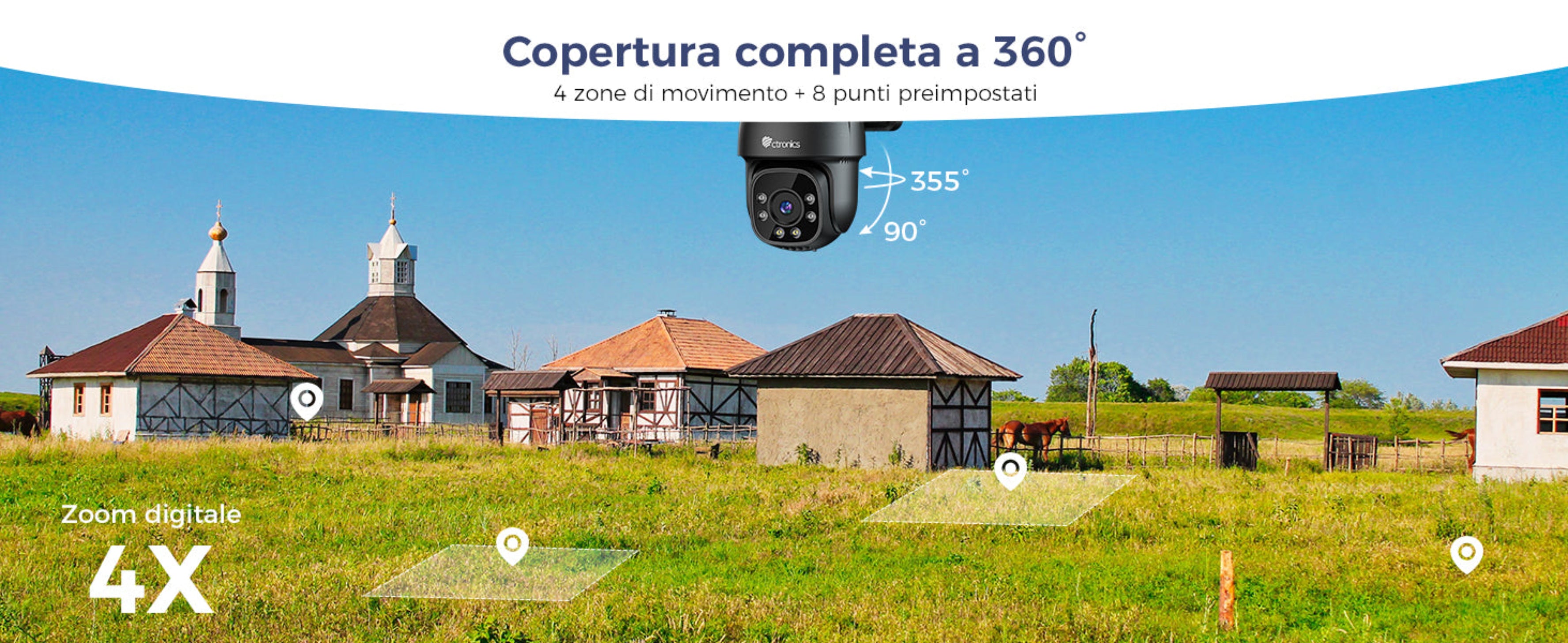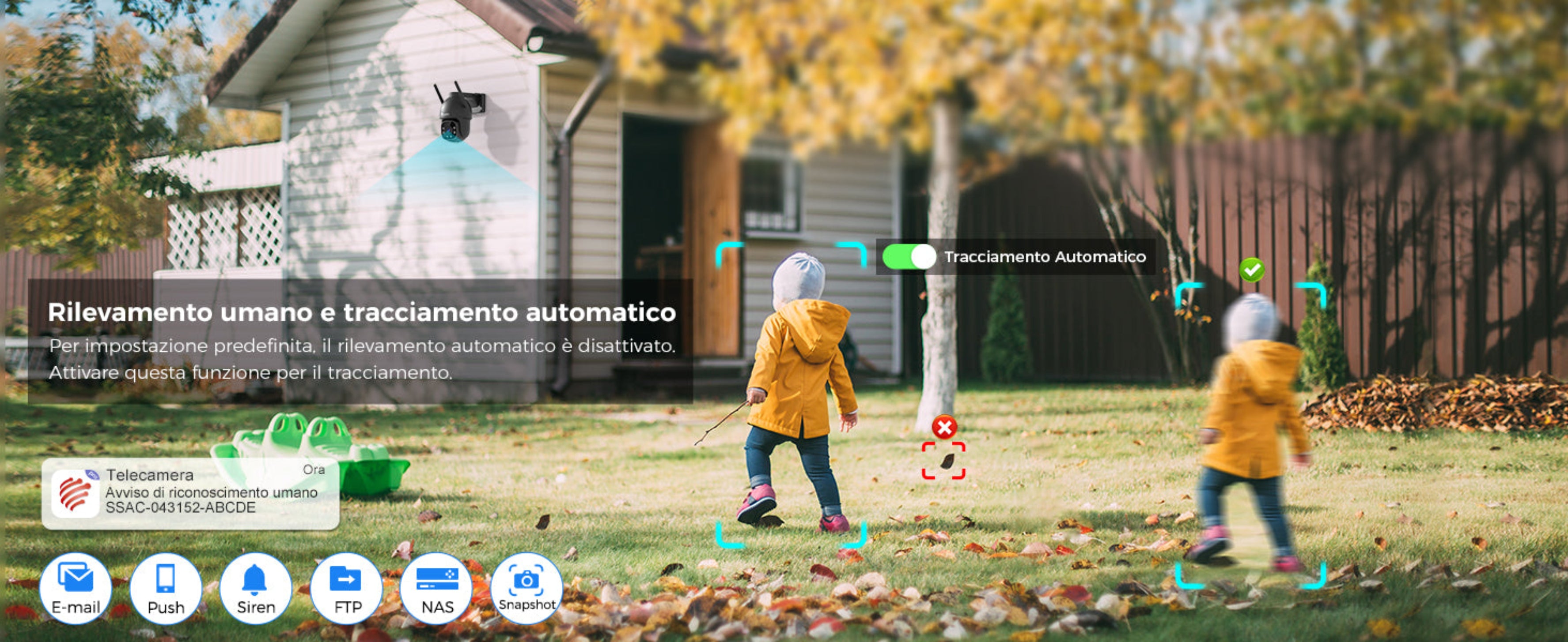 - Rilevamento umano + tracciamento automatico (zoom digitale 4x).