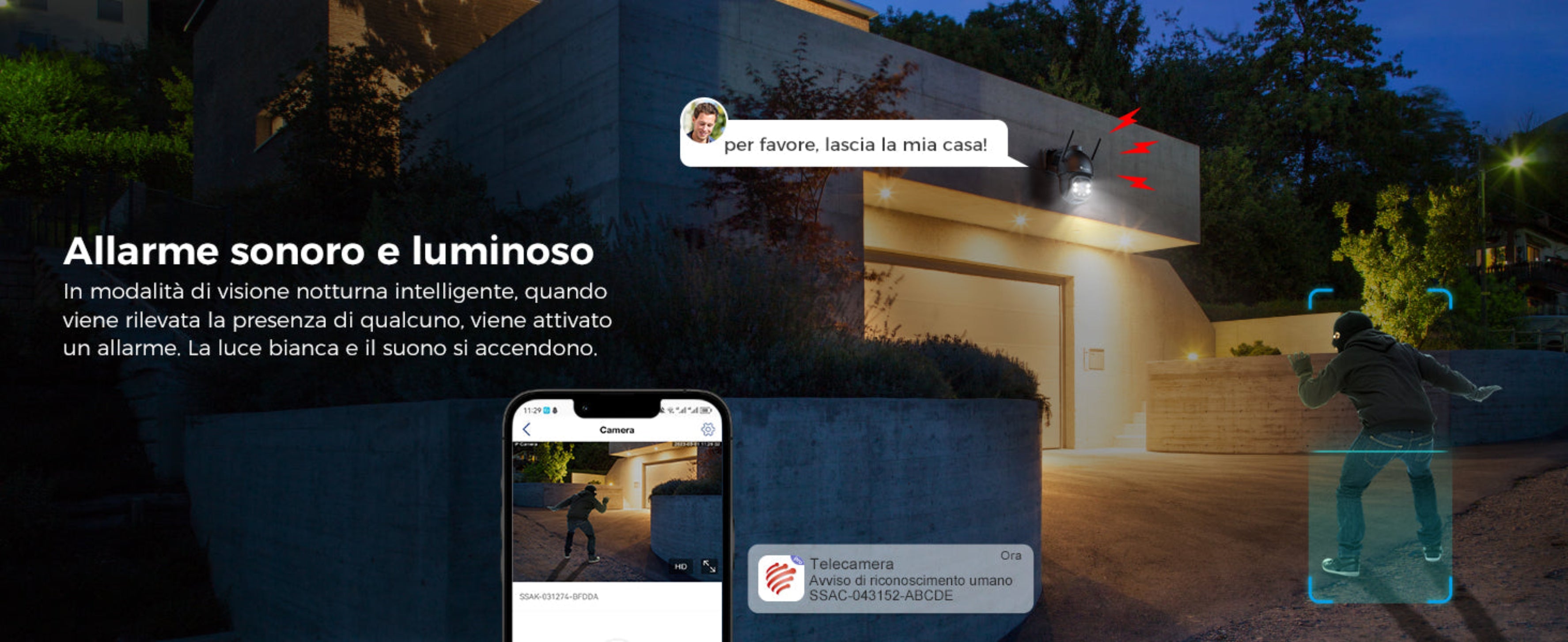 - Rilevamento umano - Tracciamento automatico - Allarme intelligente: La telecamera 4g rileva in modo intelligente i corpi umani e ne traccia i movimenti grazie allo zoom digitale 4x, riducendo fino al 95% i falsi allarmi causati da pioggia, foglie, animali e insetti. Quando l'allarme è attivato, le luci bianche lampeggiano per intimidire gli intrusi e si ricevono messaggi di allarme dall'app e dall'e-mail.
