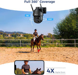 - Copertura a 360° - Visione notturna a colori 30M: Questa telecamera da esterno offre una risoluzione di alta qualità di 2 Mp con zoom digitale 4X; la rotazione orizzontale di 355° e verticale di 90° offre un angolo di visione più ampio. La telecamera esterno con sim è dotata di 2 luci bianche, 4 luci a infrarossi e una visione notturna a colori fino a 30M, che rende ogni angolo chiaramente visibile di notte.