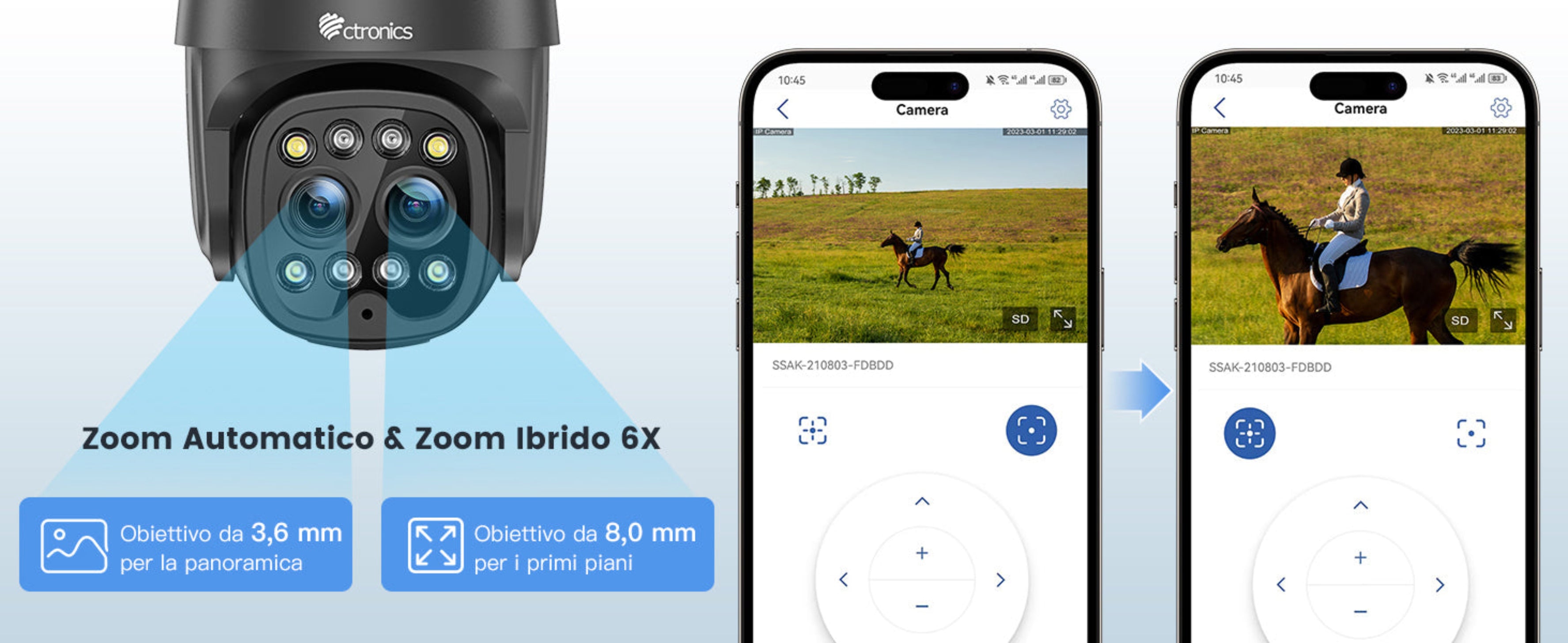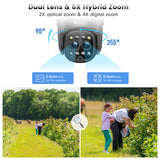 - 【Doppio obiettivo e risoluzione 1080P】Questa telecamera sim card Ctronics è dotata di doppi obiettivi, quando la videocamera sorveglianza esterno rileva le persone, cambierà automaticamente gli obiettivi per ingrandire l'immagine: il sensore A utilizza un teleobiettivo da 8mm, per catturare anche i primi piani dettagli e il sensore B utilizza un obiettivo grandangolare da 3,6mm per fornire immagini panoramiche. La telecamera 4g esterno ha una risoluzione di 1920X1080 per una visione più chiara.