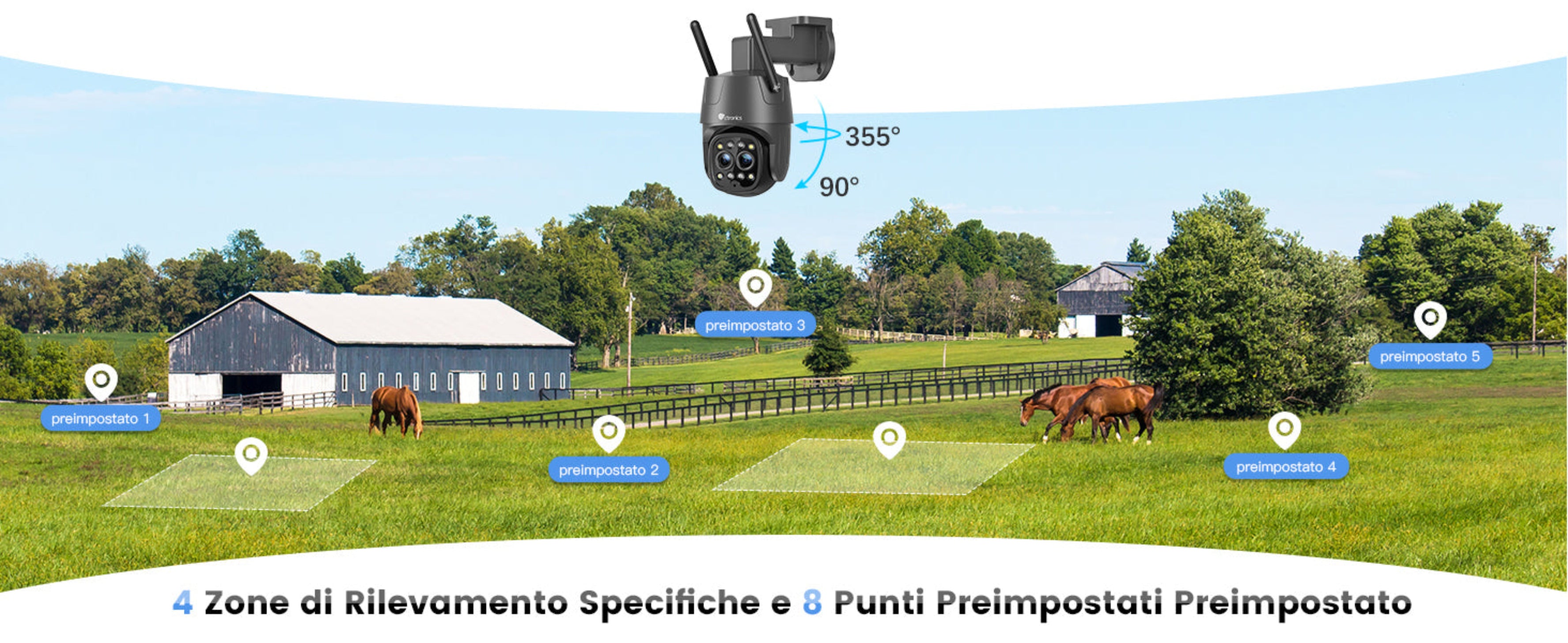 - 【Zoom Auto & Tracciamento Automatico & Rilevamento Umano】Questa telecamera di sorveglianza esterno PTZ 355° 90° è in grado di distinguere i movimenti di persone e altri oggetti, riducendo i falsi allarmi fino al 95%. Quando rileva un movimento umano, questa 4g lte telecamera avvia automaticamente il tracciamento. Se la funzione di zoom automatico è attivata, la videocamera 4g cambia automaticamente obiettivo e zooma (supporta lo zoom ottico 2x)