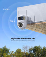 Questa videocamera sorveglianza esterno wifi funziona su WiFi a 2,4 GHz (lungo raggio) e 5 GHz (alta velocità) per garantire una connessione WiFi più flessibile e stabile, evitando perdite di segnale o interferenze.