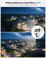 Dotata di sensori d'immagine duali da 1/3" e tre modalità di visione notturna (colorata, automatica e IR), questa telecamera esterna wifi 2MP+2MP fornisce immagini nitide, luminose e prive di rumore anche in condizioni di scarsa illuminazione, con una portata di visione notturna fino a 25 m.