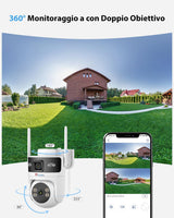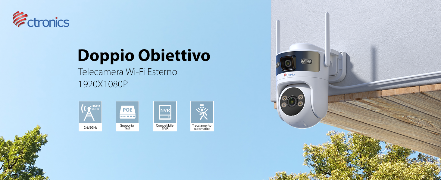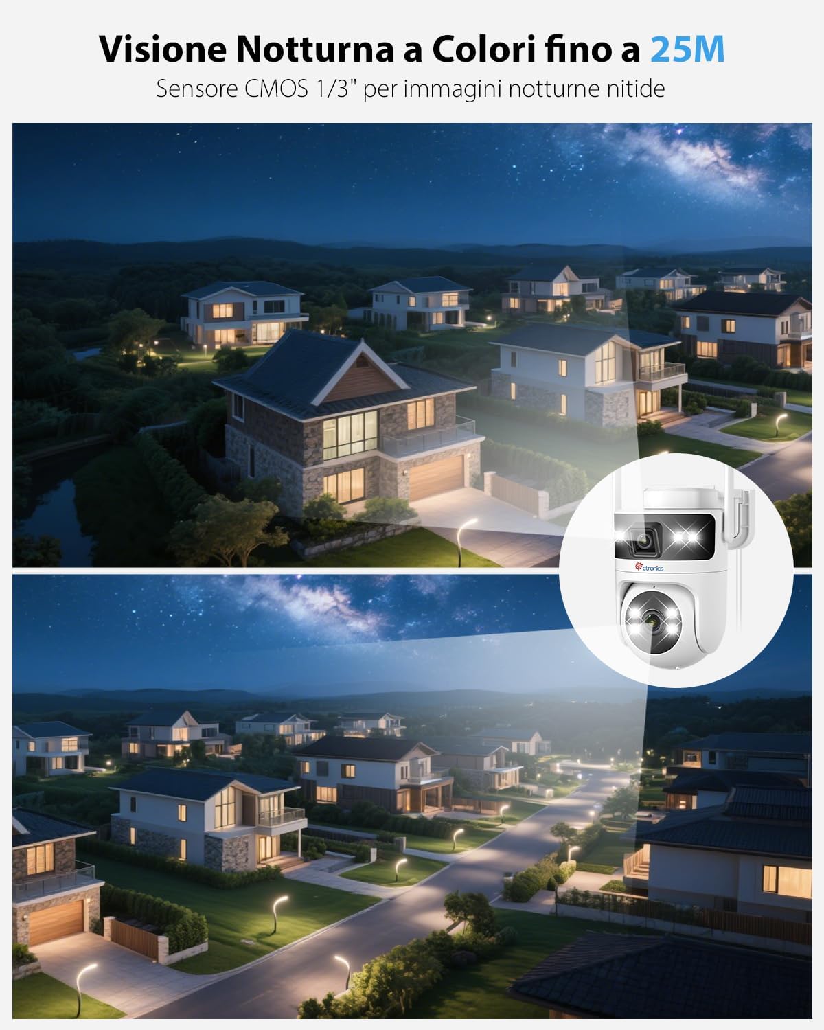 Ctronics Telecamera WiFi Esterno PTZ Doppio Obiettivo 4MP, 2.4/5GHz, Auto Tracking Umano, Visione Notturna a Colori, IP66