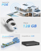 Questa telecamera wi-fi esterno è dotata di due obiettivi per due schermate live. L'obiettivo fisso da 3,6 mm mantiene una visione grandangolare e cattura l'intera scena, mentre l'obiettivo della cupola PTZ può tracciare i dettagli in tempo reale.
