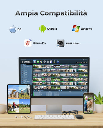 Puoi monitorare la telecamera wifi esterno tramite smartphone, tablet, PC o Mac, con compatibilità senza soluzione di continuità su più dispositivi. Supporta sistemi NVR per una gestione avanzata della sicurezza.